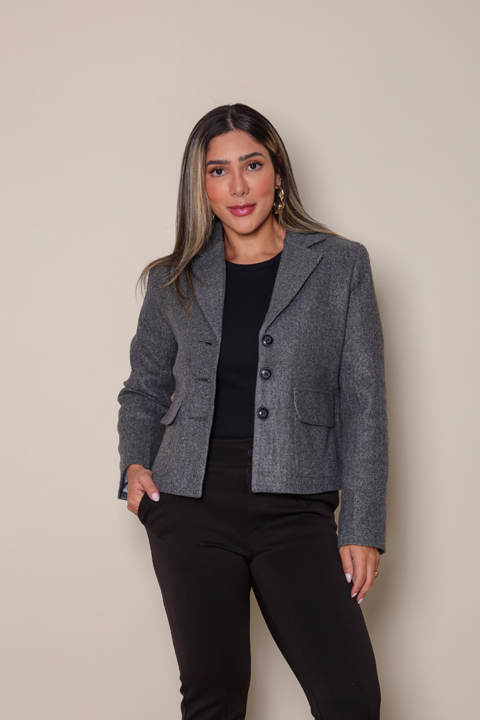 Com modelagem reta e levemente encurtada, valoriza a silhueta e garante um caimento impecável. Os botões frontais e os bolsos com abas reforçam a proposta estruturada e atemporal da peça. O tecido encorpado aquece sem pesar, tornando-o ideal para ambientes profissionais, eventos formais ou composições urbanas com toque chic.