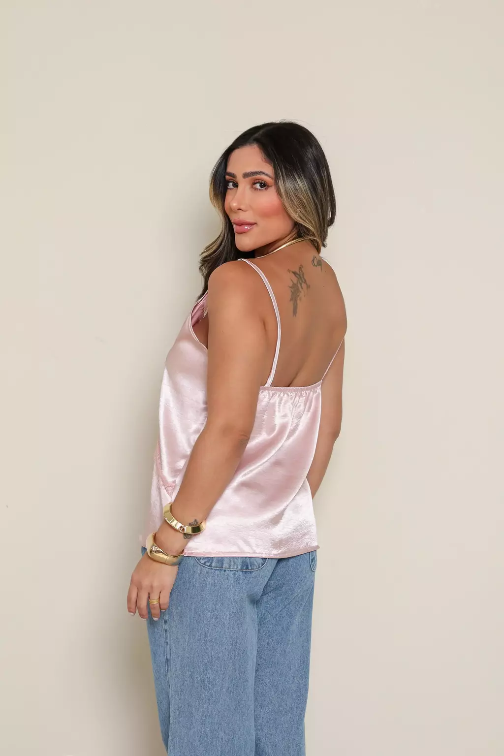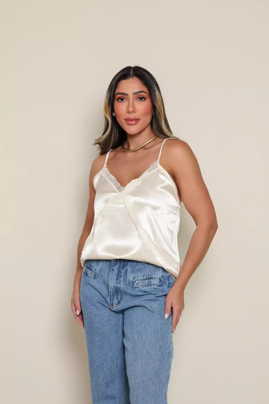 O decote em “V” valoriza o colo de forma sutil, enquanto as alças finas e o caimento fluido garantem feminilidade e modernidade. O detalhe em renda aplicada adiciona charme e delicadeza, transformando a peça em um verdadeiro clássico para composições versáteis.