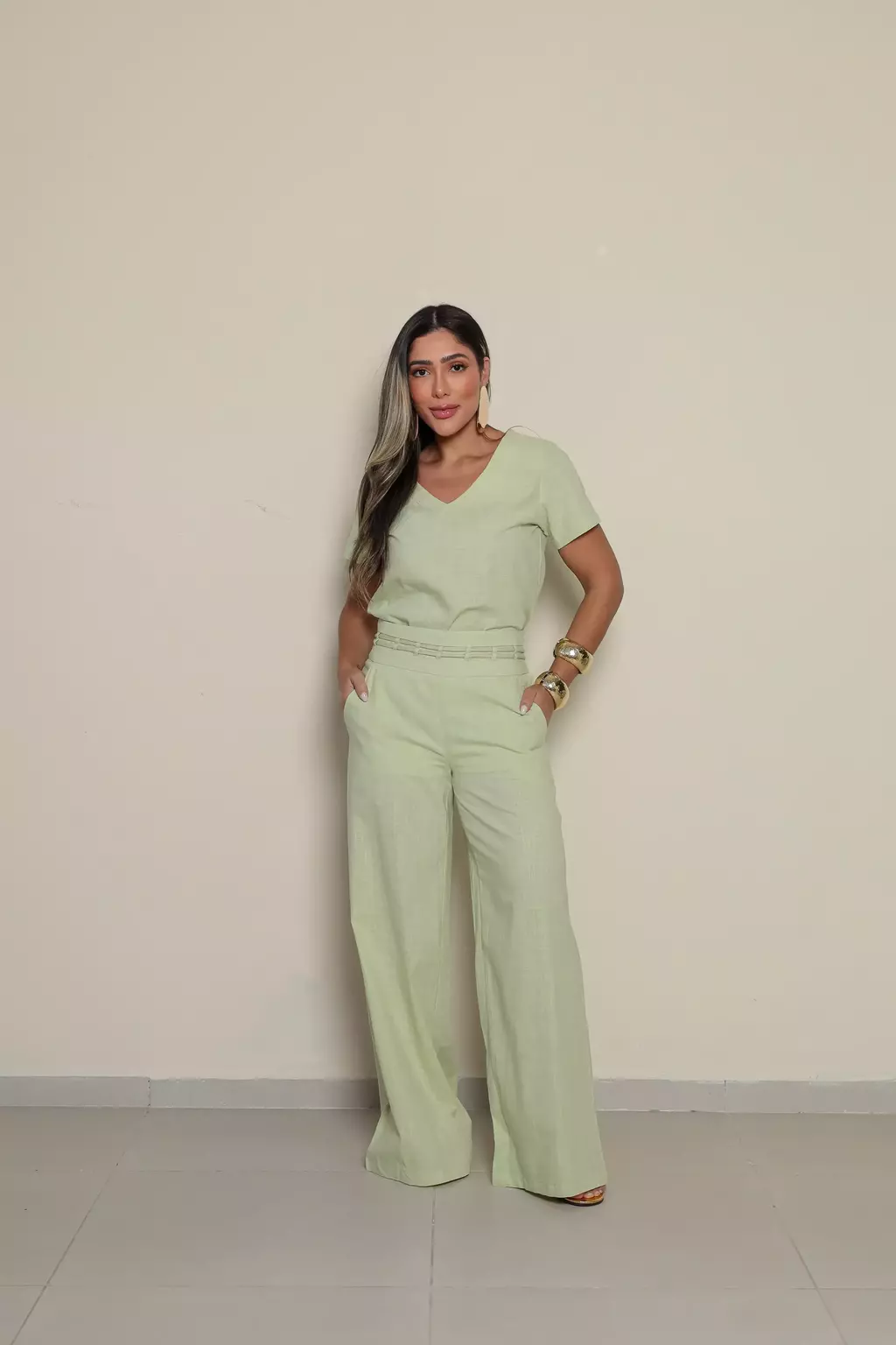 A blusa apresenta modelagem minimalista com decote em “V”, que alonga a silhueta e valoriza o colo de forma sutil. Já a calça de linho possui caimento reto com cintura marcada, bolsos práticos e corte fluido, proporcionando conforto sem perder a elegância.