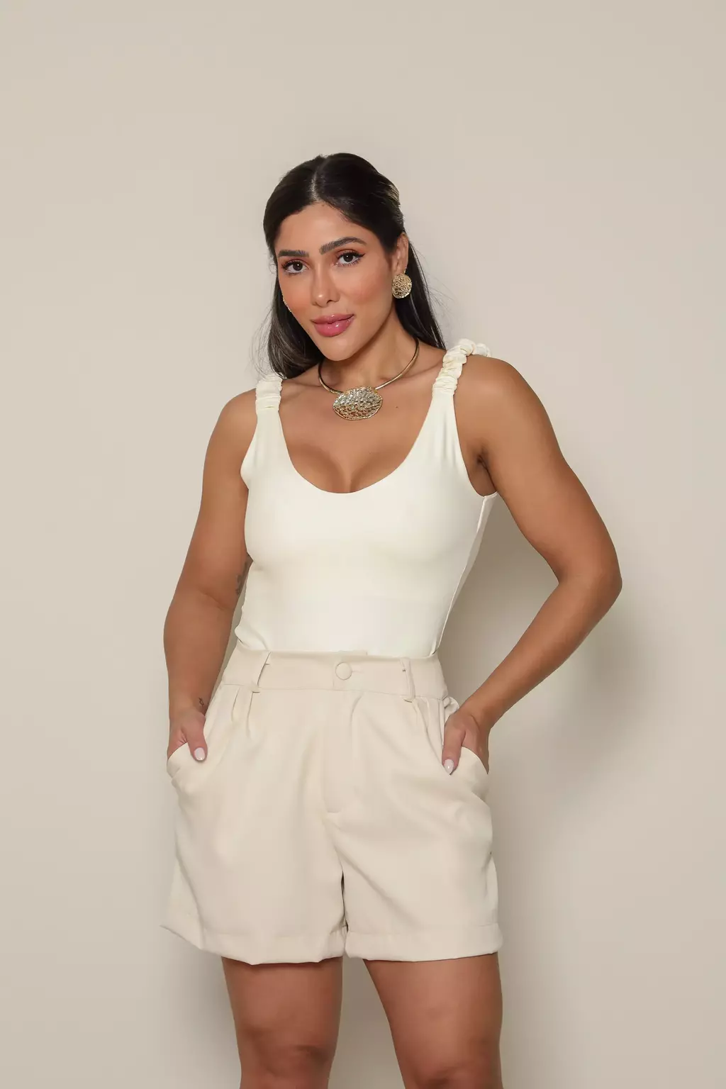 O conjunto é completado pelo short de cintura alta com pregas frontais, que traz leveza à alfaiataria tradicional. O cós estruturado valoriza a silhueta e garante conforto, criando um equilíbrio perfeito entre o clássico e o moderno.