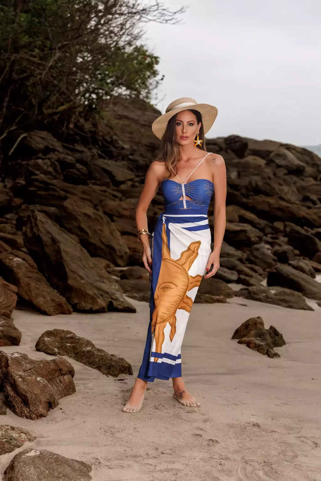 O pareô que acompanha o maiô é confeccionado em um tecido leve e fluido, perfeito para sobrepor e adicionar um toque de elegância ao seu look de praia. A estampa de figuras do sol, presente tanto no maiô quanto no pareô, traz um charme tropical e um brilho alegre ao conjunto. O pareô pode ser usado de várias maneiras – como saia, vestido ou saída de praia – permitindo diferentes estilos e proporcionando versatilidade.