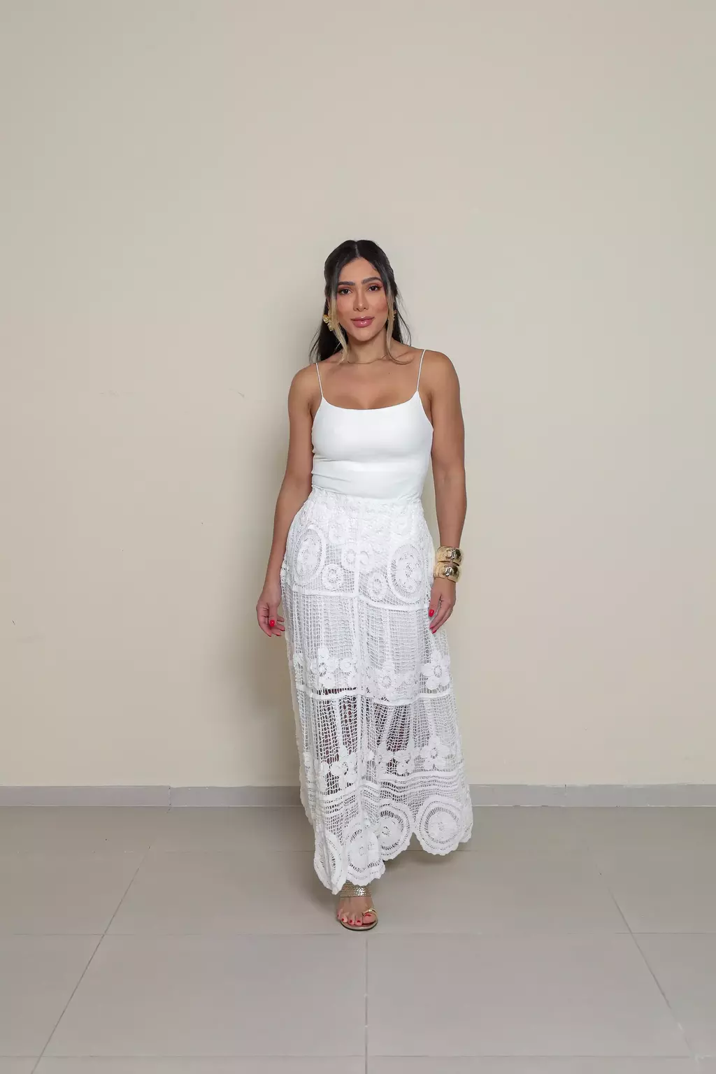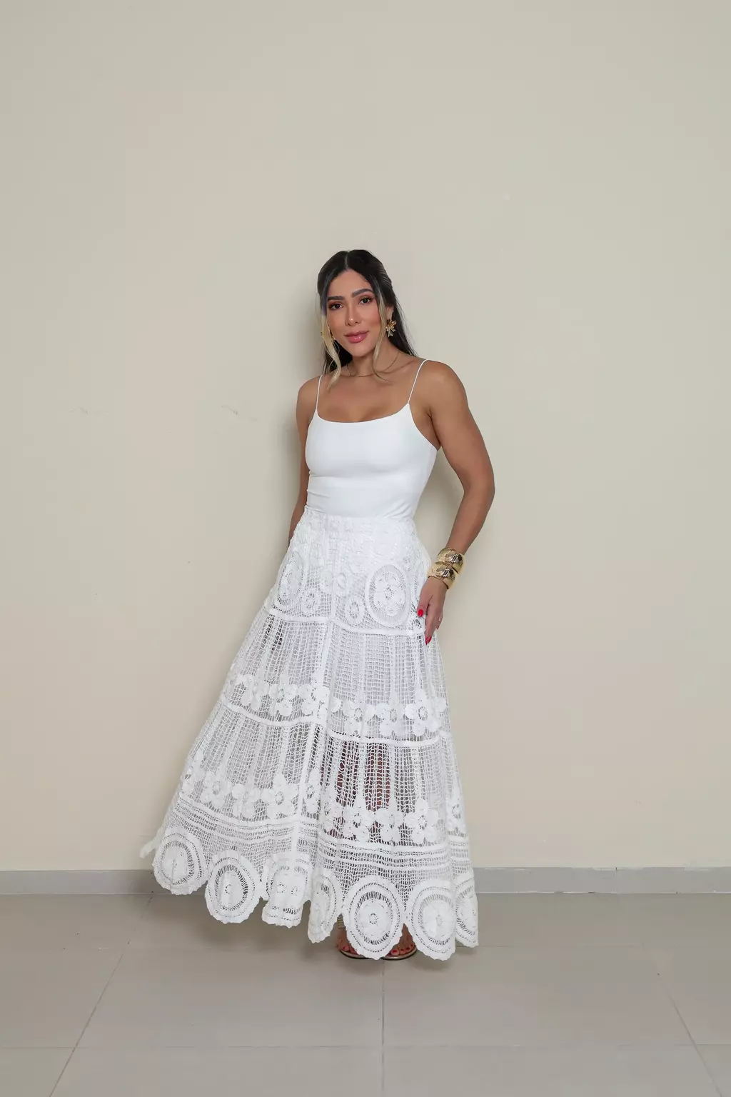 O comprimento midi garante movimento fluido e leveza, enquanto a transparência sutil entre os desenhos do crochê acrescenta delicadeza e um toque de sensualidade discreta. Versátil, é perfeita para produções diurnas cheias de frescor ou para composições noturnas mais sofisticadas.